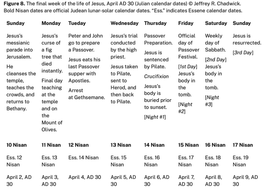 This chart, by Jeffrey R. Chadwick, I find is very, very well considered, and was very useful to me in pondering upon the Savior’s last week prior to Easter. Although copyrighted by Chadwick, it is available on the BYU Studies website in a different form. “Dating the Death of Jesus Christ” By Jeffrey R. Chadwick, BYU Studies Quarterly 54:4