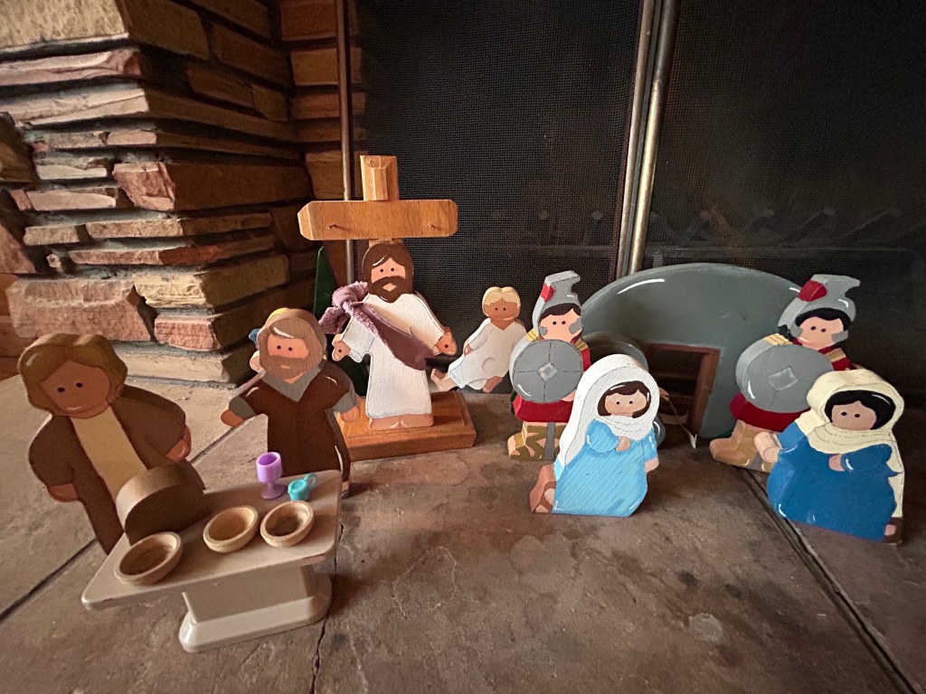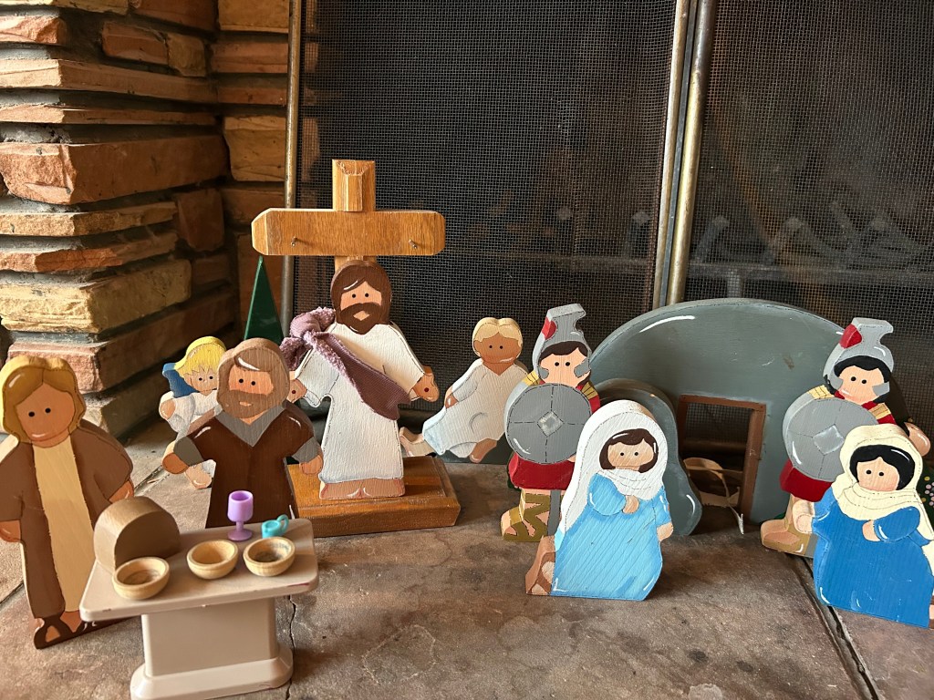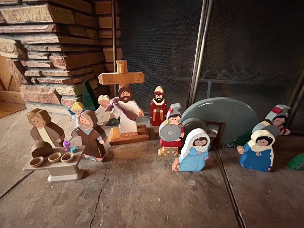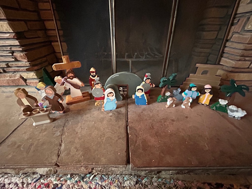 The following are pictures of an expanded crèche display my wife made which includes Easter, and the Book of Mormon aspects of these holidays.