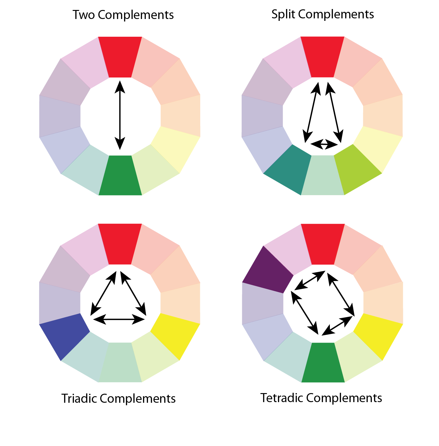 Other Types of Complements Other Types of Complements There are other types of complements that can be used besides simply two complementary colors. They include spilt complements and triadic complements, each with three colors, and tetradic complements of four colors. Each has a particular usefulness. Next Page Previous Page Table of Contents Share this: Click to share on X (Opens in new window) X Click to share on Facebook (Opens in new window) Facebook Like Loading...