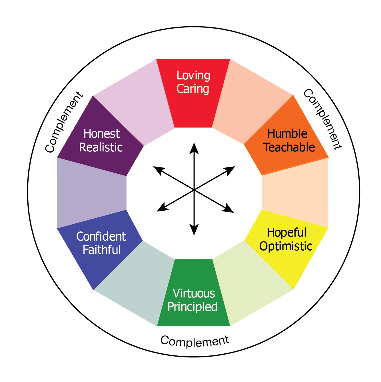 If loving, hopeful and faithful are the primary virtues, then what would constitute their complements? Like complementary colors, secondary virtues would need to balance the primary virtues, be an “opposite” in some way. In the same way mercy should not rob justice, the primary virtues cannot rob their complementary virtues. Thus,