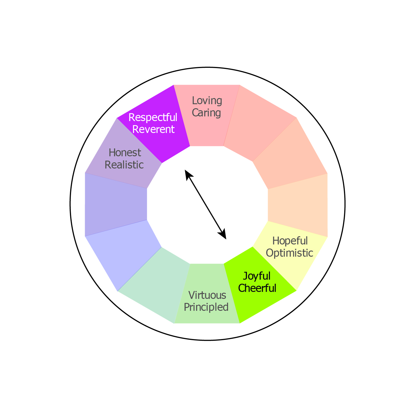 Joyful is between Hope and Virtue, because it has an element of innocence to it, like Virtue, and yet is hopeful; the future is bright.